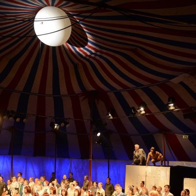 ”Det blåser på månen” är med sitt stora och knasiga persongalleri som gjord för att spelas så som nu sker i Margaretaparken söder om Söder; i Enskedespelet samlas proffs och amatörer, barn och vuxna till myllrande och folklig teater under fast ledning av regissören Johanna Huss.”